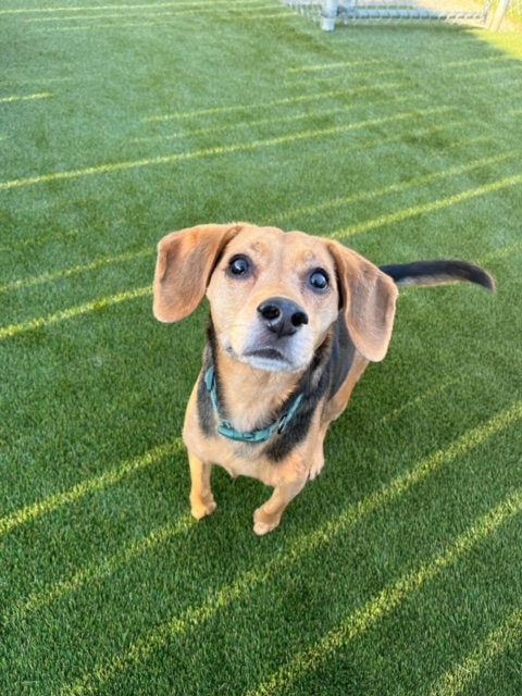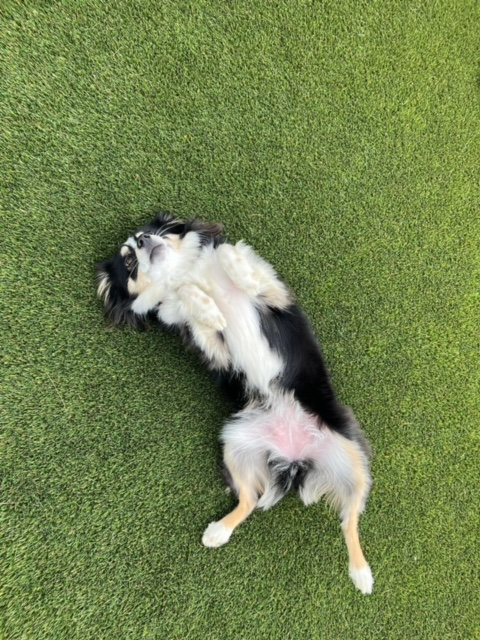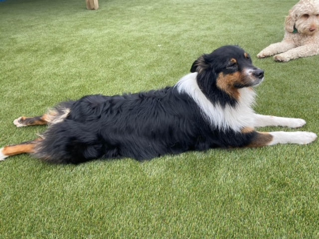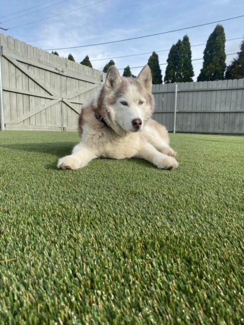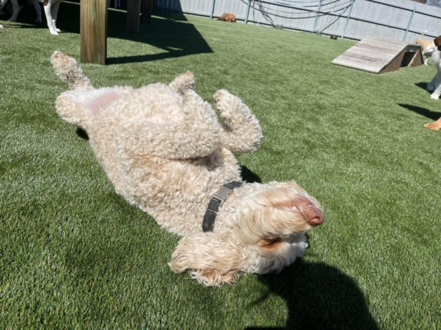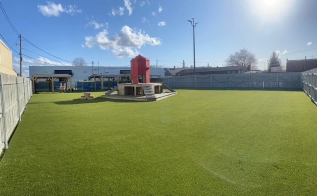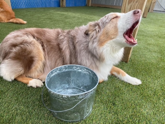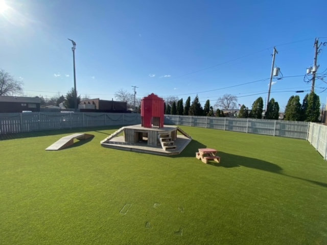 Our outside area has plenty of space to roam and run! Our artificial grass surface is the highest quality system available today! It is cool on sensitive paws!), and has a high end drainage system, which allows us to keep it ultra clean, safe for your pup, unlike real (turns to mud), and pea gravel surfaces which are hard on dogs paws and impossible to clean. We also have some of the coolest outdoor play equipment in the nation, and water flows non stop into our pools in the summer!